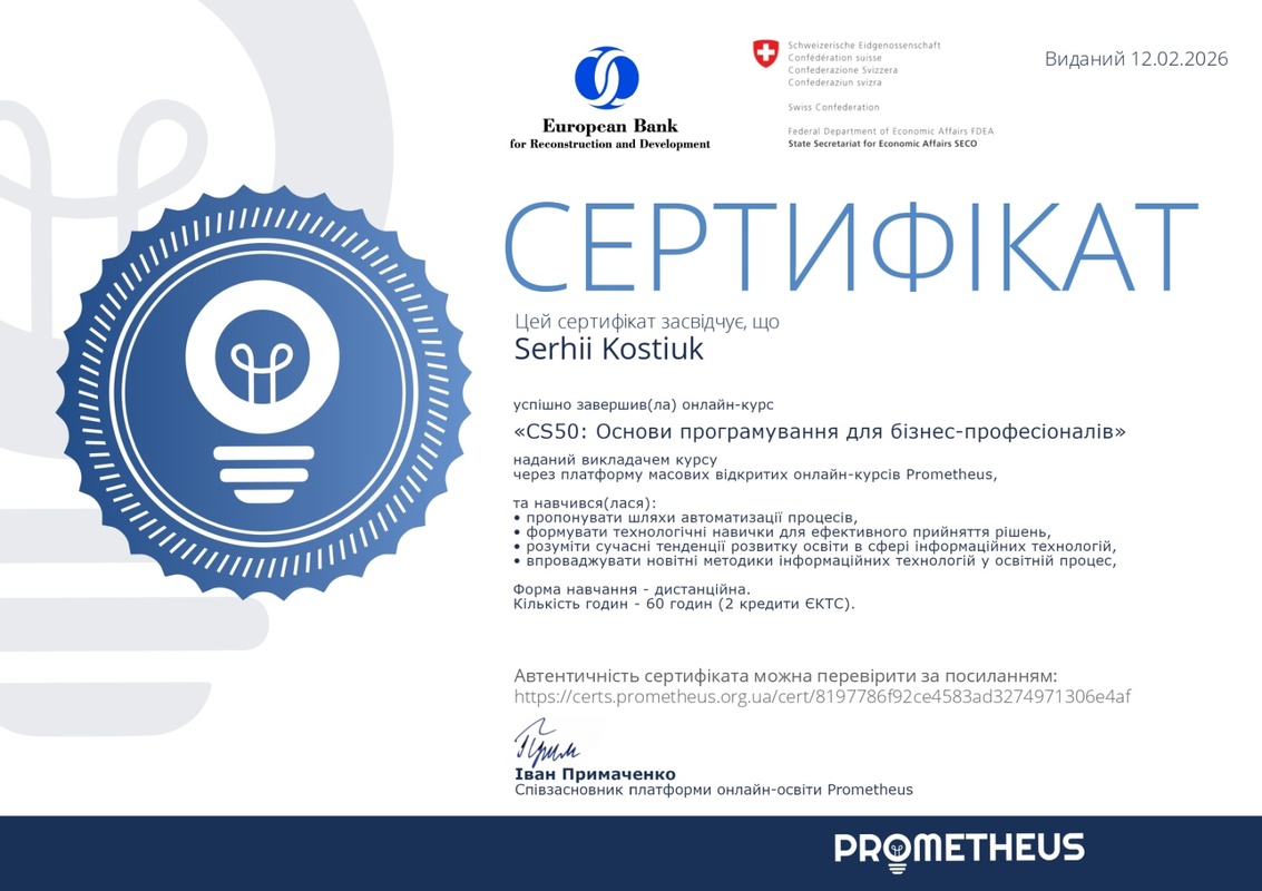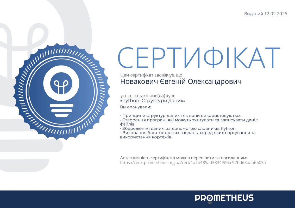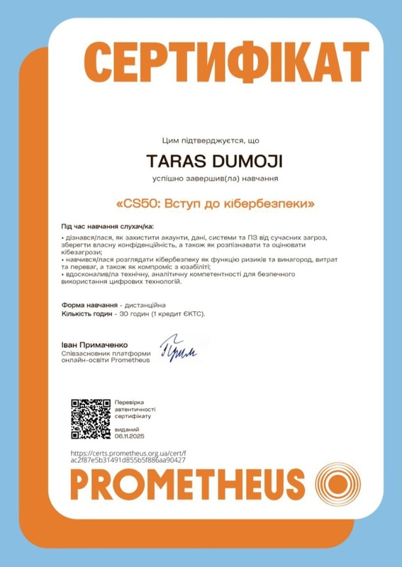 У лютому 2026 року здобувачі Вадим ПАВЛЕНКО (41к-н), Тарас ДУМИК (41к-н), Михайло ГОРБЕНКО (41к-н), Артур СТУДЕНІКІН (21к-кн), Уляна ГРИГОРЕНКО (31к-н), Євгеній НОВАКОВИЧ (21к-кн), Ілля ХУДЧЕНКО (31к-кн), Сергій КОСТЮК (21к-кн) успішно завершили навчання за низкою масових відкритих онлайн-курсів на платформі Prometheus, зокрема: «CS50: Основи програмування для бізнес-професіоналів», «Python: Структури даних», «CS50: Вступ до кібербезпеки», «Цифрова безпека на персональному рівні».
