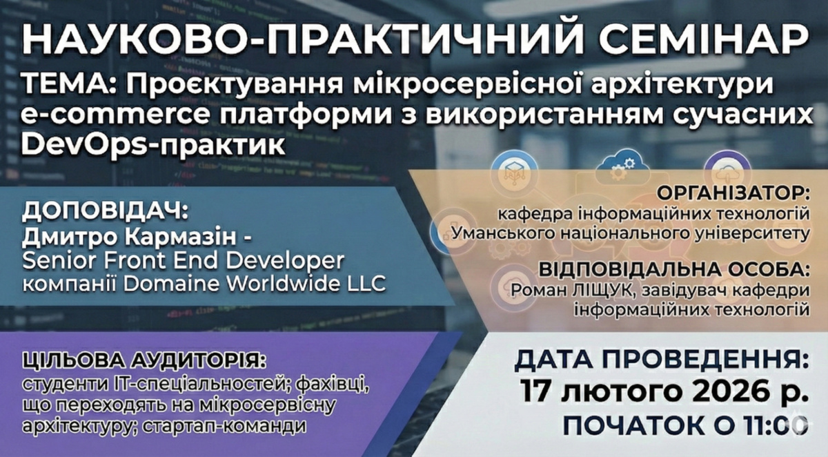 Кафедра інформаційних технологій Уманського національного університету запрошує ІТ-спільноту на актуальний науково-практичний семінар, присвячений передовим підходам у розробці сучасного програмного забезпечення.